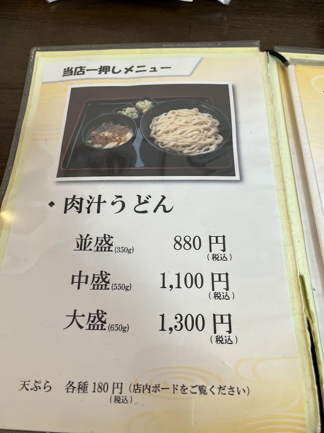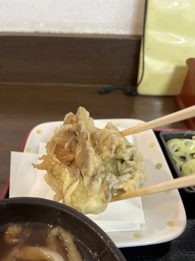肉汁うどんの並に、まいたけの天ぷらです。