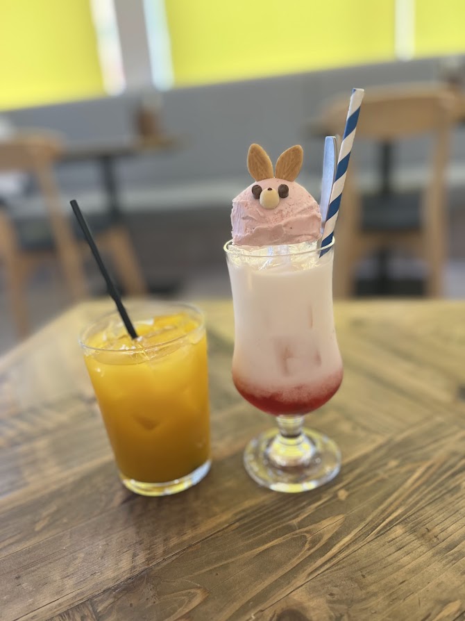 牛乳の苦手な私はマンゴージュース。