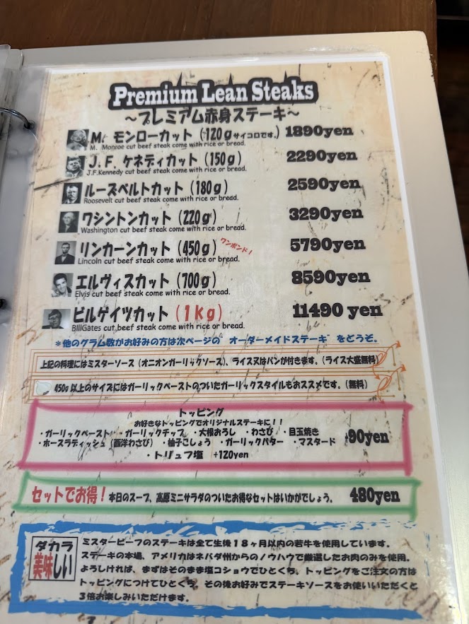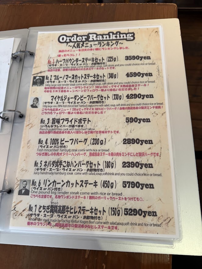 メニューはステーキからハンバーグまでいろいろ。