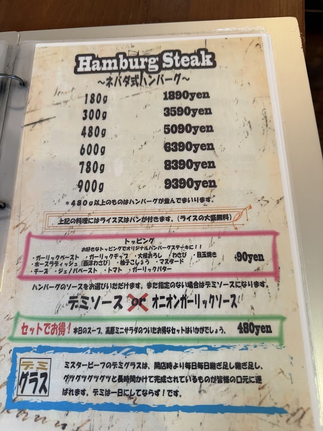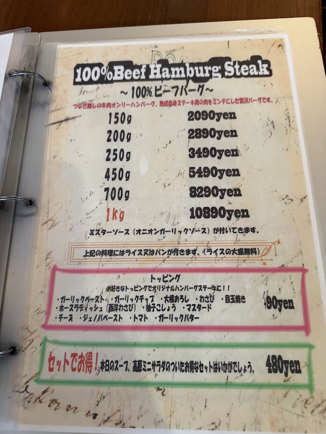 メニューを見て美味しそうなのでビーフ100パーのハンバーグをチョイス。