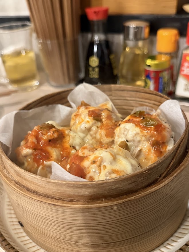 黒板メニューのチーズサルサ焼売。