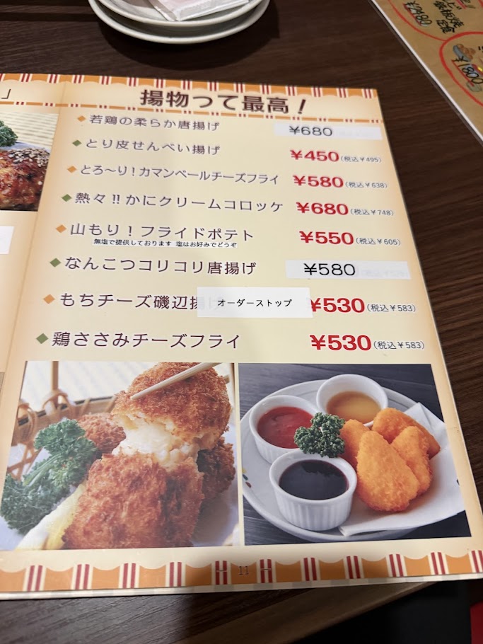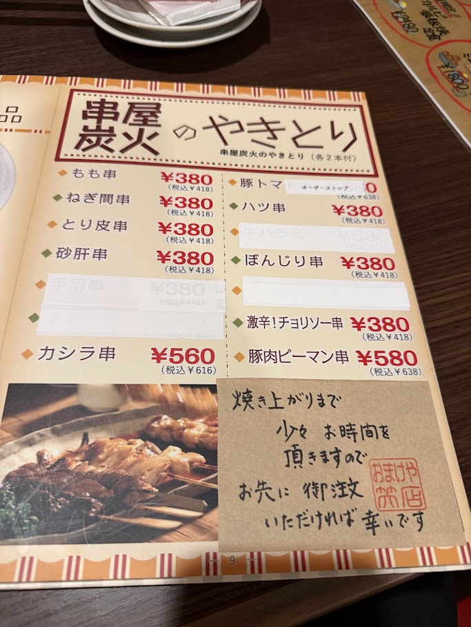 シールが貼られた焼き鳥メニュー。